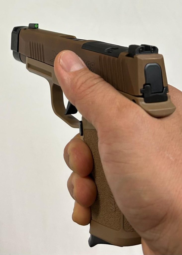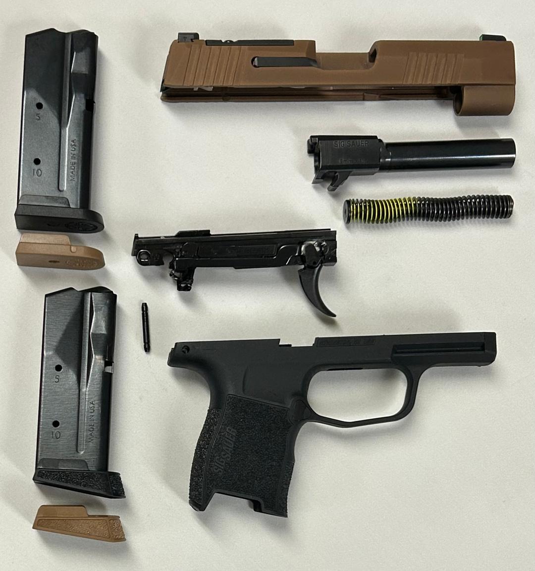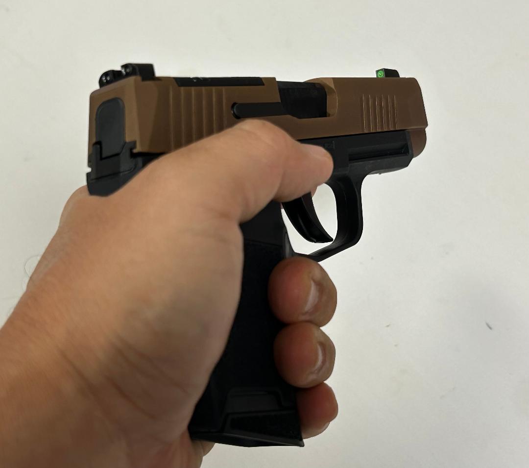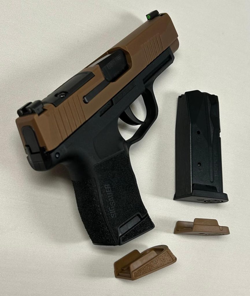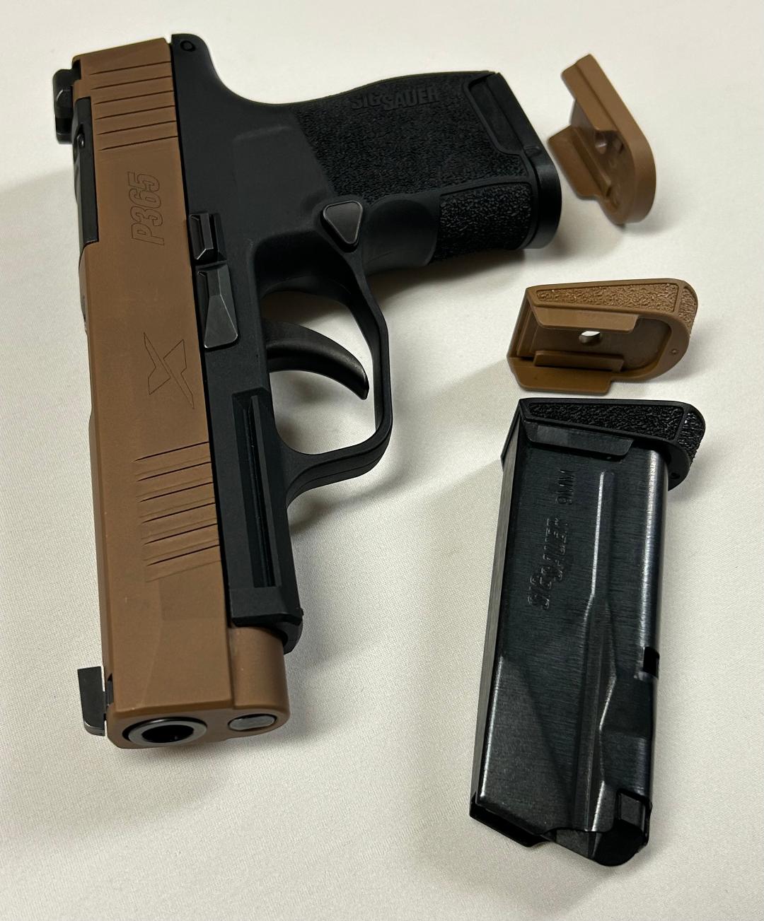 Sig Sauer P365 compact (smallest) grip module, Coyote slide, 3.7″ barrel, Sig tritium night sights, both black & tan flush and extended baseplates